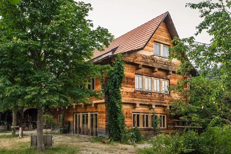 Individuelle Häuser aus Holz, Lehm und Stein.